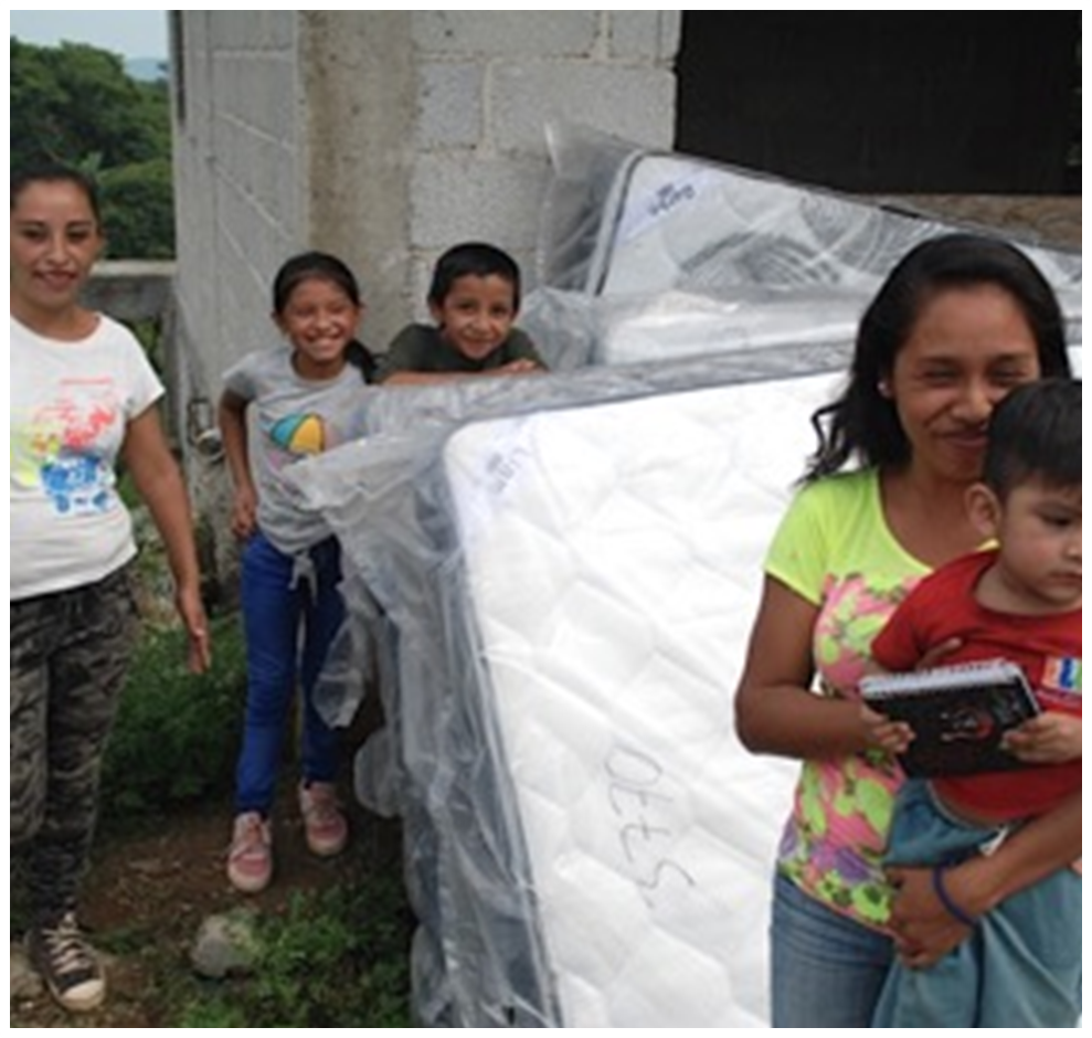 2.5 Apoyo a casas dañadas en la comunidad de Loma Bonita. Entregamos 5 colchones y 2 licuadoras para dos familias, que sus casas fueron, seriamente, dañadas por una tormenta, en la comunidad de Loma Bonita. Nuevamente, agradecemos al BANCO DE ALIMENTOS CÁRITAS PUEBLA por su generoso donativo de los colchones y las licuadoras.